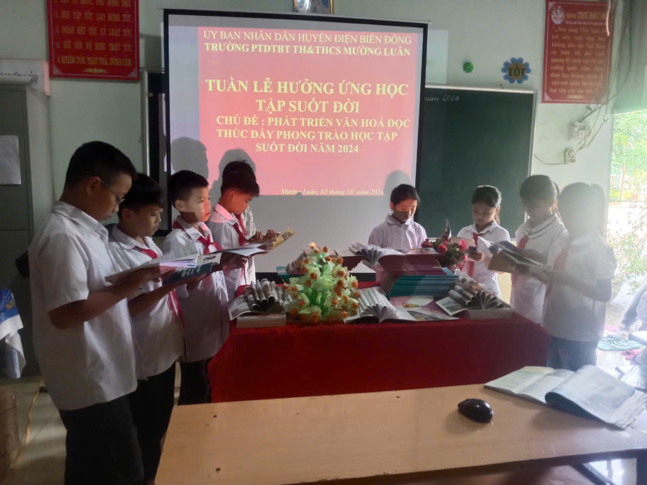 Tuần lễ Học tập suốt đời với chủ đề "Phát triển văn hóa đọc thúc đẩy phong trào học tập suốt đời" là một lời nhắc nhở tất cả mọi người về tầm quan trọng của việc đọc sách. Hưởng ứng Tuần lễ đó, sáng ngày 02/10/2024 Trường PTDTBT TH & THCS Mường Luân đã tổ chức một buổi đọc sách toàn trường. Tạo nên không khí đọc sôi nổi với nhiều hình thức đọc khác nhau: đọc theo nhóm, đọc cá nhân,…Mỗi em một quyển, mỗi em một câu chuyện đọc cho nhau nghe rất sôi nổi.